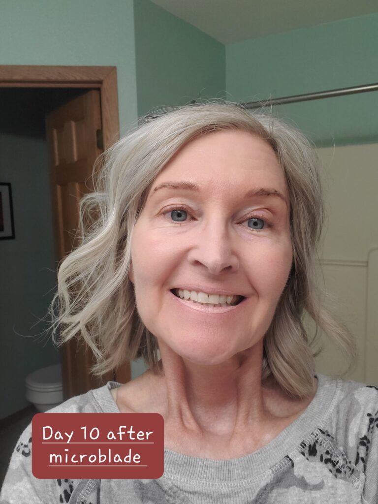This is also considered the “ghosting phase” because the remaining pigment has yet to rise to the outer surface of the skin to reveal the final results. Personally, I’m finding the “ghosting phase” is still an improvement over my pre-microbladed eyebrows.